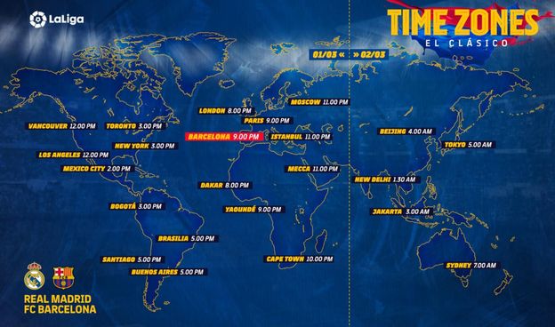 En l'estat espanyol, el matx començarà a les 21 hores d'aquest proper diumenge 1 de març i es podrà veure per Movistar LaLiga. Arreu del món, es podrà seguir al minut a minut del Match Center del web del Club i també a través dels perfils oficials a les diferents xarxes socials. A continuació oferim, a més, la llista amb els horaris i els canals televisius que retransmetran el partit entre el Reial Madrid i el FC Barcelona.