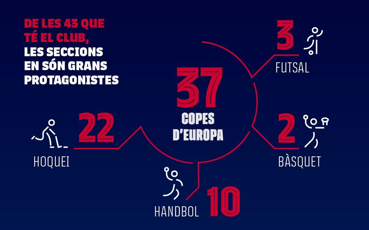 El FC Barcelona és l’únic equip que competeix al màxim nivell amb sis equips professionals de cinc esports diferents (futbol, bàsquet, handbol, hoquei patins i futbol sala) i l’únic que ha aconseguit fins al moment 43 Copes d’Europa, de les quals, 37 les han aportat els equips del Palau Blaugrana.