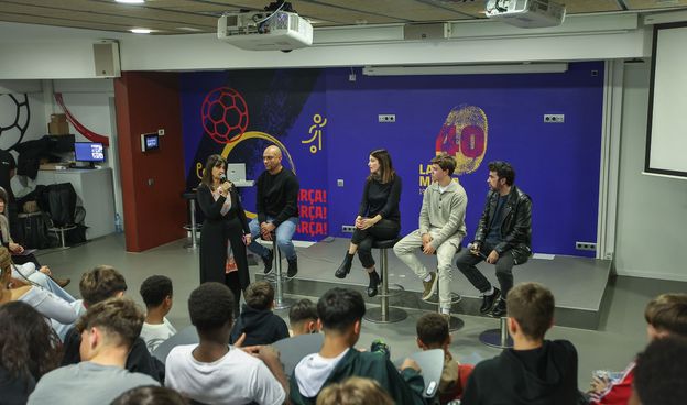 En una acció conjunta entre la Fundació FC Barcelona, Disney+ i LALIGA, una important representació dels nois i noies que es formen a La Masia del FC Barcelona va assistir ahir a la projecció en primícia del primer episodi d’‘Invisible’, una sèrie de 6 capítols que mira de combatre el bullying donant-li visibilitat, que s’estrena avui, 13 de desembre, a Disney+. Després de veure aquest primer episodi, els joves esportistes blaugrana van participar en un interessant col·loqui, moderat per Laura Sabaté, coordinadora de projectes de la Fundació FC Barcelona, amb Ari Santos, coordinador formatiu de futbol sala i delegat de protecció del FC Barcelona; Alejandra Aróstegui, productora executiva de Disney+; Paco Caballero, director d’‘Invisible’, i Eric Seijo, un dels protagonistes de la sèrie.
