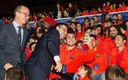 Una gran foto de tots els esportistes situats a la graderia del Palau, al costat del president Josep Maria Bartomeu, del vicepresident Jordi Cardoner i del directiu Oriol Tomàs ha servit per obrir aquest acte de presentació que ha seguit amb els parlaments dels directius blaugrana.